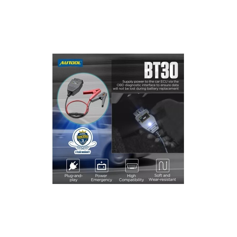PLUG AND PLAY, EL AUTOOL ECU MEMORY PROTECTOR SE PUEDE UTILIZAR CON CUALQUIER FUENTE DE ALIMENTACIÓN DE 12V DC, INCLUYENDO ARRANCADORES DE EMERGENCIA, BATERÍAS DE PLOMO-ÁCIDO DC 12V, O TOMAS DE CORRIENTE DC 12V EN OTROS VEHÍCULOS.