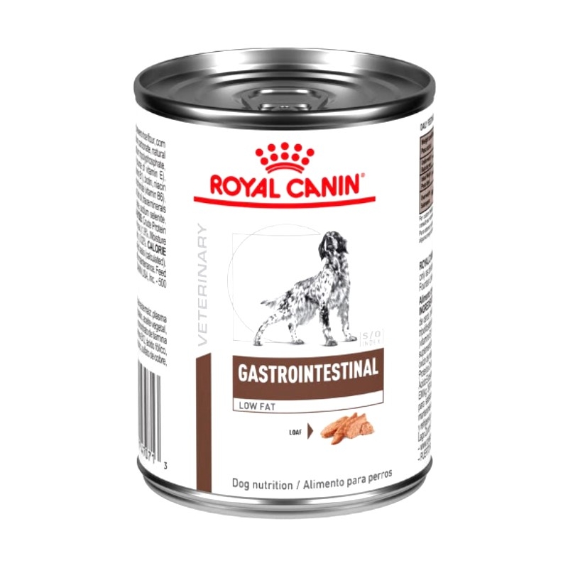 Alimento húmedo Royal Canin Gastro-Intestinal Low Fat para perros con pancreatitis aguda y crónica, diarrea aguda y crónica, insuficiencia ancreática exócrina (IPE), hiperlipidemia, síndrome de mala absorción, deficiencia de ácidos biliares, parásitos intestinales, diarrea por cambio de dieta y síndrome del intestino delgado. Disponible en: 390g.