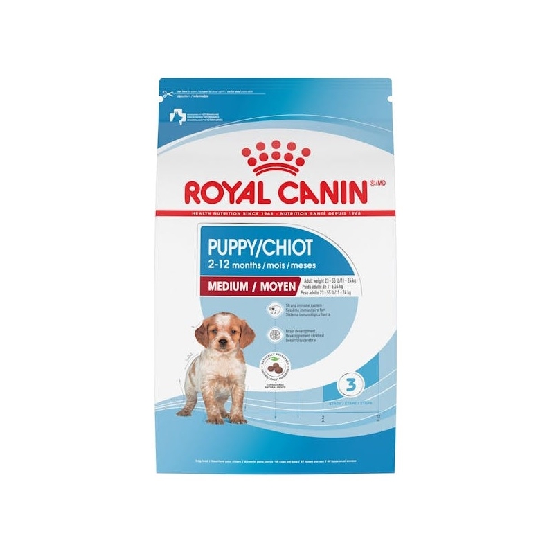 Alimento seco especialmente formulado para satisfacer las necesidades nutricionales de los cachorros de raza mediana de entre 2 y 12 meses de edad.