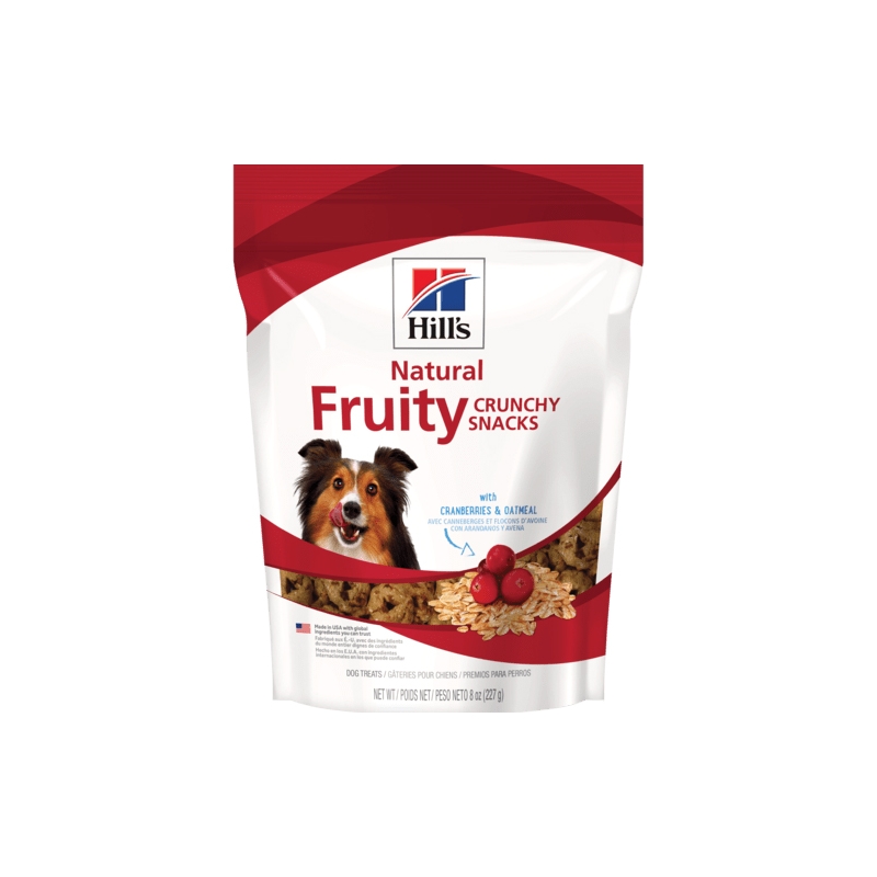 Hill's® Natural Fruity Crunchy Snacks with Cranberries & Oatmeal son deliciosos premios naturales para perros hechos con solamente los mejores ingredientes. Cada premio está horneado con pedazos de fruta verdadera y hará feliz a su perro. Sin conservadores o saborizantes artificiales.