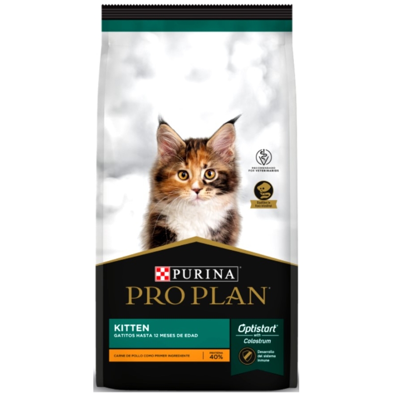 Alimento seco Pro Plan para gato cachorro ded hasta un año de edad. Alimento balanceado para gatitos en crecimiento de hasta 12 meses de edad y hembras gestantes o lactantes. Formulado con una mezcla innovadora de nutrientes, como el calostro rico en anticuerpos naturales. Esta mezcla única ayuda a extender la protección que empezó con la leche materna, reforzando la salud intestinal del gatito y ayudando a reducir el riesgo de trastornos digestivos.