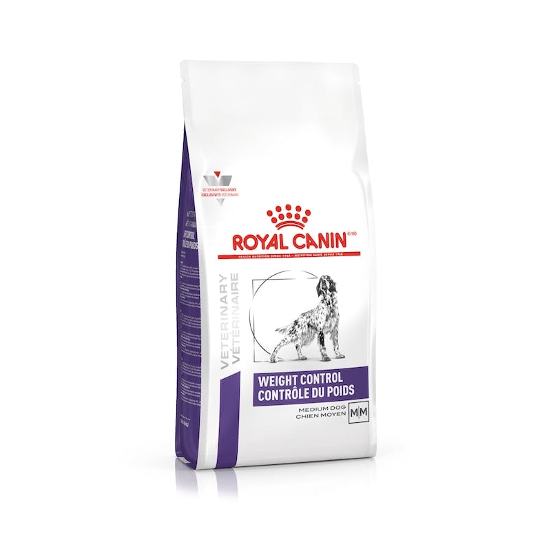 - Alimento seco Royal Canin Weight Control para perros adultos de talla mediana, con tendencia al sobrepeso o esterilizados. A partir de los 12 de meses de edad. Disponible en: 8kg