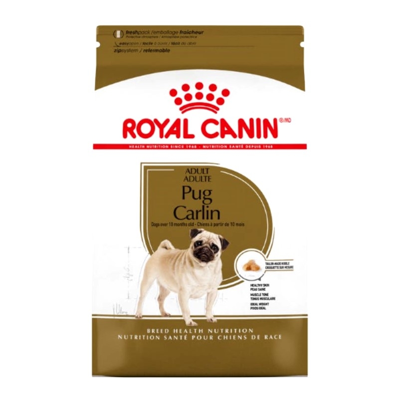 Alimento seco Royal Canin específico para perros adulto Pug a partir de los 10 meses de edad. Disponible en: 4.5kg.