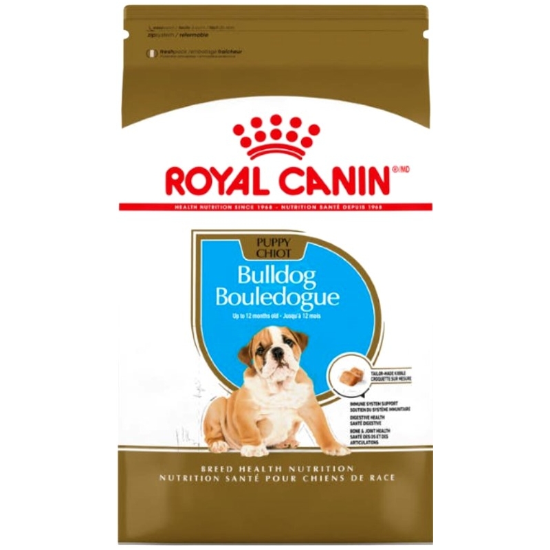 Alimento seco Royal Canin específico para cachorros Bulldog Inglés de los 2 meses hasta los 12 meses de edad. Disponible: 13.6kg.