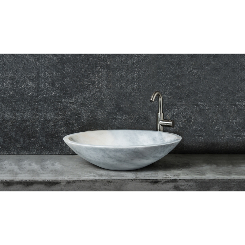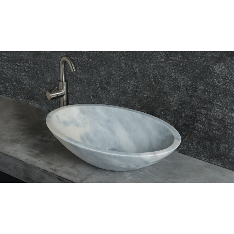 Oval countertop washbasin in white-gray marble. Carved by craftsmen out of a solid block, it has an elegant profile and soft, balanced, and symmetrical curves.