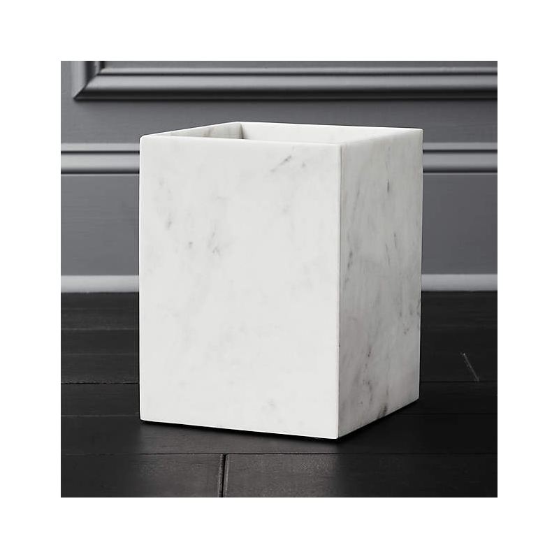 Esculpe un lugar limpio en tu baño. Pulido liso en blanco suave con vetas naturales de color gris, cesto de basura con estilo.