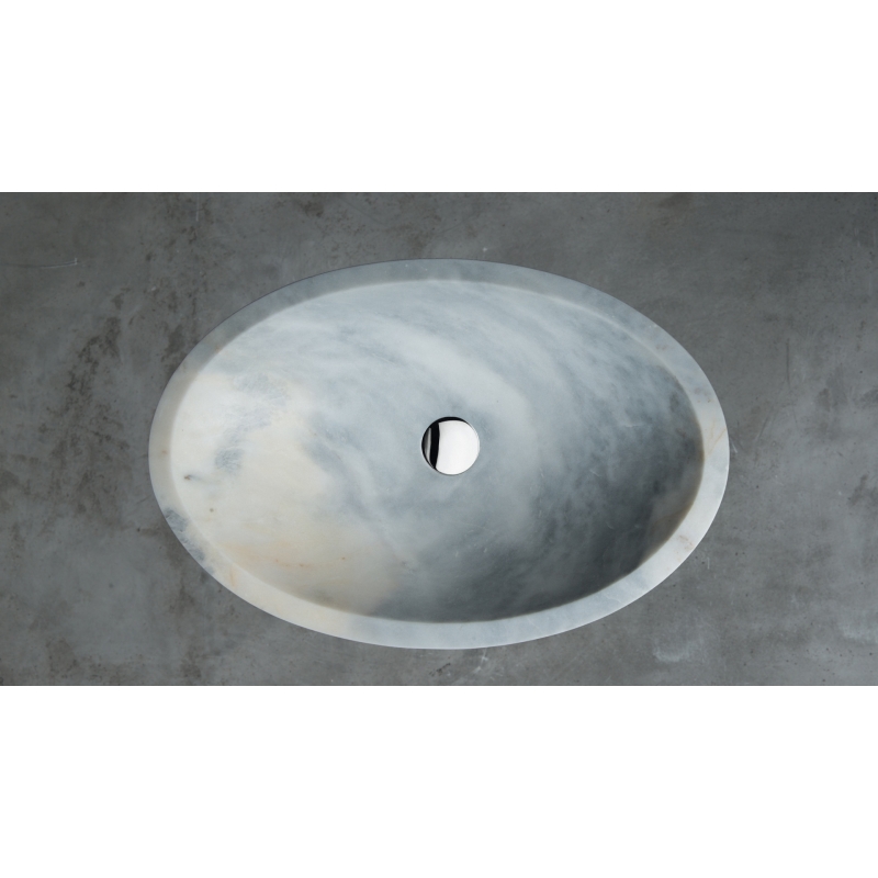 Lavabo sobre encimera ovalado en mármol blanco grisáceo. Tiene un perfil elegante y curvas suaves, equilibradas y simétricas.