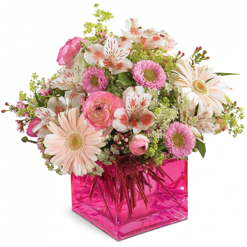 Esplendido arreglo de 100 flores de colores en fina canasta de mimbre blanca tejida a mano o florero de vidrio.