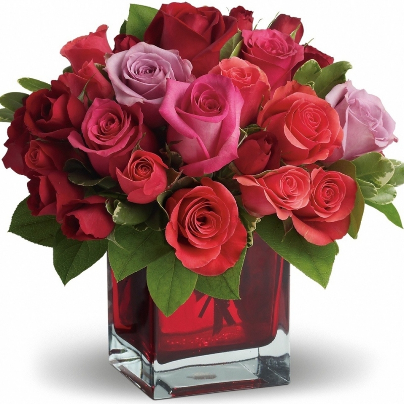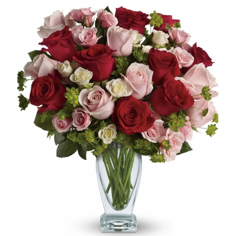 Bouquet de rosas. Con 50 rosas de invernadero, de generosos botones y follaje rojo a combinación, realizamos este arreglo de presencia limpia y a la vez tierna.