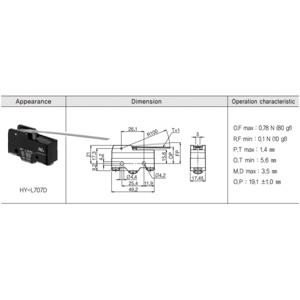 Micro Switch básico con palanca 100mm 1NA+1NC 10amp 250vca HANYOUNG