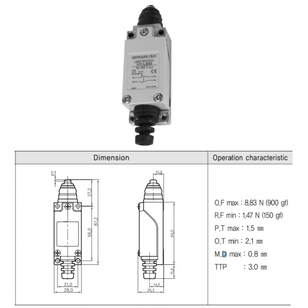 Mini limit switch con Embolo 1NA+1NC 6amp HANYOUNG