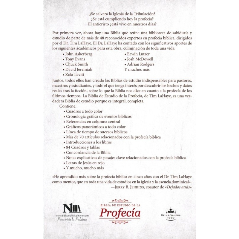 ¿Se salvará la Iglesia de la Tribulación? ¿Se está cumpliendo hoy la profecía? El anticristo ¿está vivo en nuestros días? Por primera vez, ahora hay una Biblia que reúne una biblioteca de sabiduría y estudio de parte de más de 48 reconocidos expertos en profecía bíblica, dirigidos por el Dr. Tim LaHaye. Juntos, todos ellos han creado las Biblias de estudio indispensables para pastores, maestros y estudiantes, y todo el que tenga interés por descubrir los hechos y datos reales tras la ficción, sobre lo que la Biblia nos dice en cuanto a la profecía de los últimos tiempos. La Biblia de Estudio de la Profecía, de Tim LaHaye, es una verdadera Biblia de estudio porque es integral, completa. Contiene: