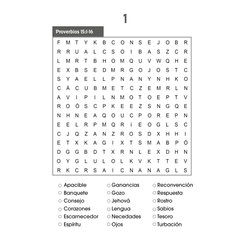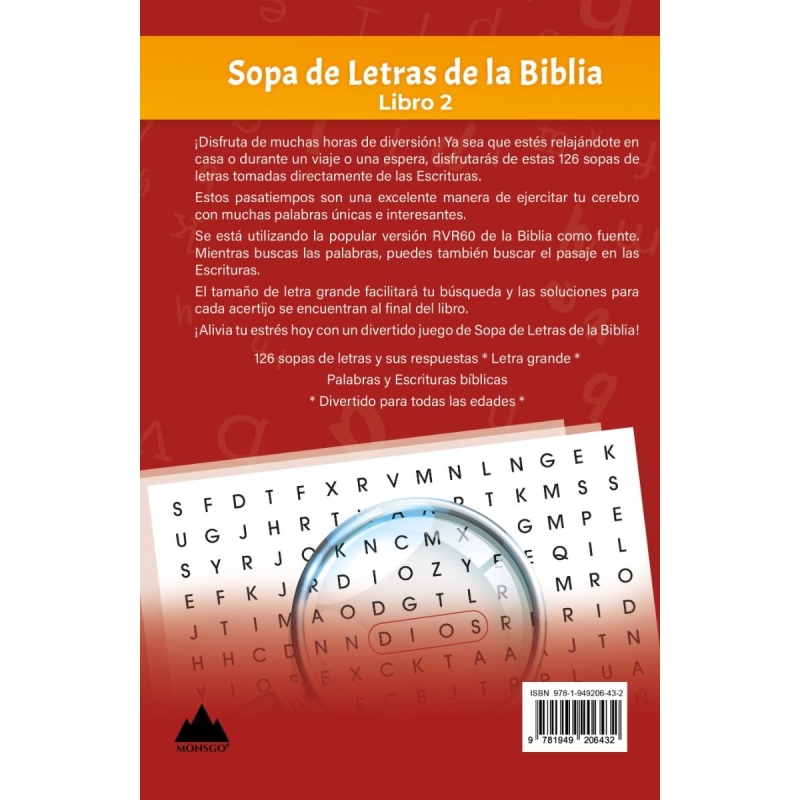 Estas 126 divertidas sopas de letras son tomadas directamente de las Escrituras son una excelente manera de ejercitar tu cerebro con muchas palabras únicas e interesantes. Se está utilizando la popular versión RVR60 de la Biblia como fuente y mientras buscas las palabras, puedes también buscar el pasaje en las Escrituras. El tamaño de letra grande facilitará tu búsqueda y las soluciones para cada acertijo se encuentran al final del libro.