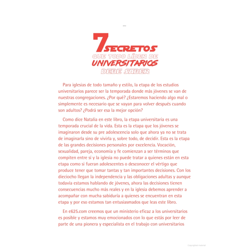 Para iglesias de todo tamaño y estilo, la etapa de los estudios universitarios parece ser la temporada donde más jóvenes se van de nuestras congregaciones. ¿Por qué? ¿Estaremos haciendo algo mal o simplemente es necesario que se vayan para volver después cuando son adultos? ¿Podrá ser esa la mejor opción? Como dice Natalia en este libro, la etapa universitaria es una temporada crucial de la vida. Esta es la etapa que los jóvenes se imaginaron desde su pre adolescencia solo que ahora ya no se trata de imaginarla sino de vivirla y, sobre todo, de decidir. Esta es la etapa de las grandes decisiones personales por excelencia. Vocación, sexualidad, pareja, economía y fe comienzan a ser términos que compiten entre sí y la iglesia no puede tratar a quienes están en esta etapa como si fueran adolescentes o desconocer el vértigo que produce tener que tomar tantas y tan importantes decisiones. Con los dieciocho llegan la independencia y las obligaciones adultas y aunque todavía estamos hablando de jóvenes, ahora las decisiones tienen consecuencias mucho más reales y en la iglesia debemos aprender a acompañar con mucha sabiduría a quienes se encuentran en esta etapa y por eso estamos tan entusiasmados que leas este libro.