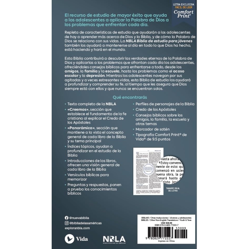 Llena de características de estudio que ayudarán a los adolescentes de hoy a aprender más acerca de Dios y la Biblia, y de cómo la Palabra de Dios se relaciona con sus vidas. La NBLA Biblia de Estudio para Jóvenes también los ayudará a mantenerse al día en todo lo que Dios ha hecho, está haciendo y hará en el mundo.