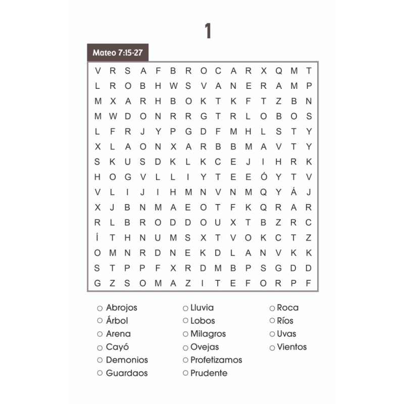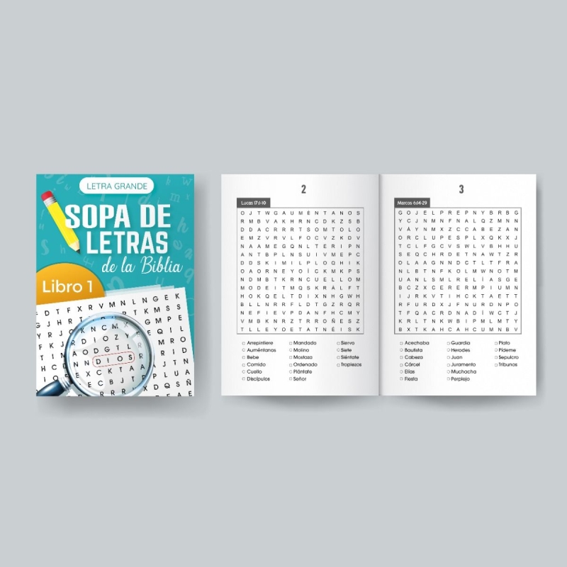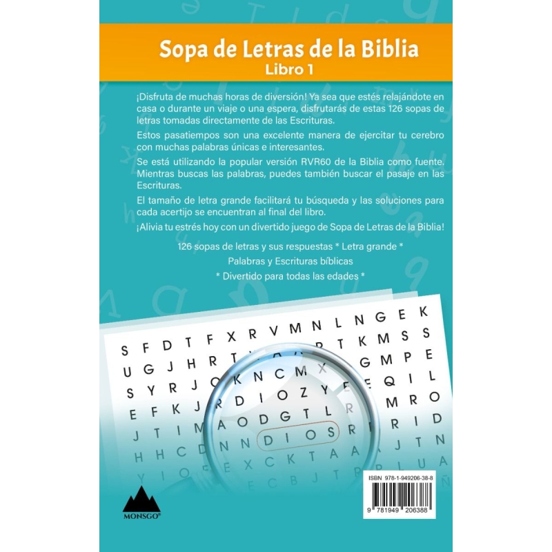 ¡Disfruta de muchas horas de diversión! Ya sea que estés relajándote en casa o durante un viaje o una espera, disfrutarás de estas 126 sopas de letras tomadas directamente de las Escrituras. Estos pasatiempos son una excelente manera de ejercitar tu cerebro con muchas palabras únicas e interesantes. Se está utilizando la popular versión RVR60 de la Biblia como fuente. Mientras buscas las palabras, puedes también buscar el pasaje en las Escrituras. El tamaño de letra grande facilitará tu búsqueda y las soluciones para cada acertijo se encuentran al final del libro.