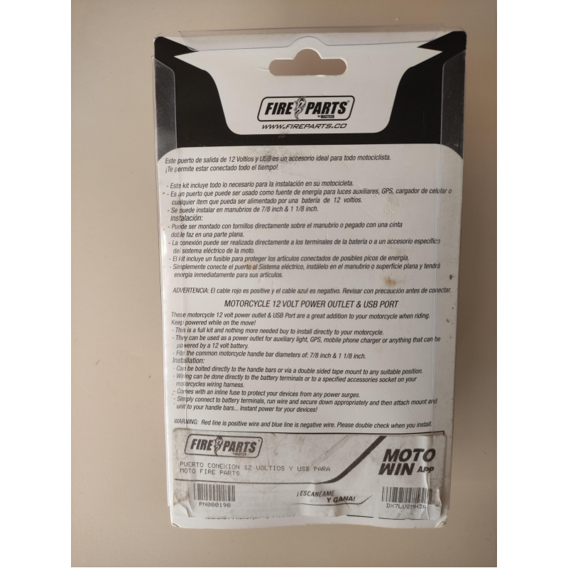 Este practico cargador de la marca colombiana Fire Parts cuenta con dos puertos para cargar todo tipo de dispositivos: un puerto USB y un puerto tipo encendedor de cigarrillos. Se  puede instalar con facilidad a un sin fin de motocicletas para que conectes tus dispositivos y se mantengan siempre cargados.