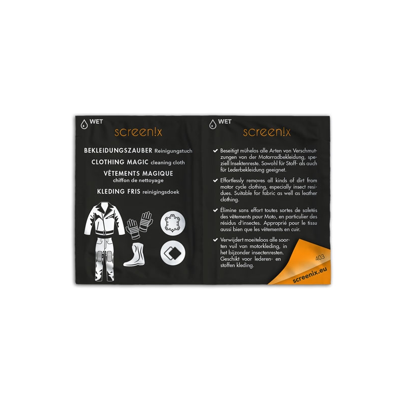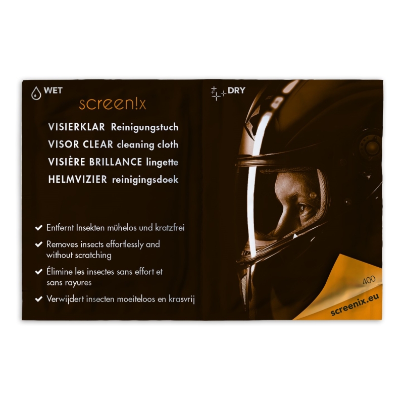 Los paños de limpieza transparentes Screen!x Visor Clear desarrollados y fabricados en Austria son fáciles de usar: simplemente use el paño húmedo para eliminar todos los residuos de insectos de la visera y el casco y luego limpie con el paño seco para evitar rayas y reflejos.