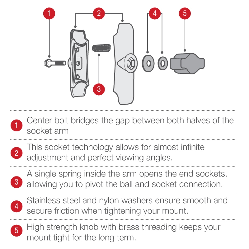 El RAP-B-201U, es un brazo de plástico compuesto con longitud media, tiene una entrada en ambos extremos que se adapta a las bolas de tamaño B de 1". Un único resorte dentro del brazo mantiene abierta la toma, lo que permite insertar la bola en la conexión. La tecnología de socket de RAM permite un ajuste casí infinito para lograr el ángulo de visión perfecto.
