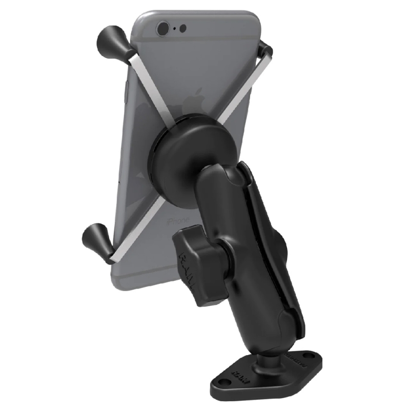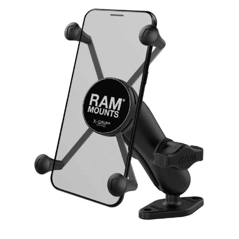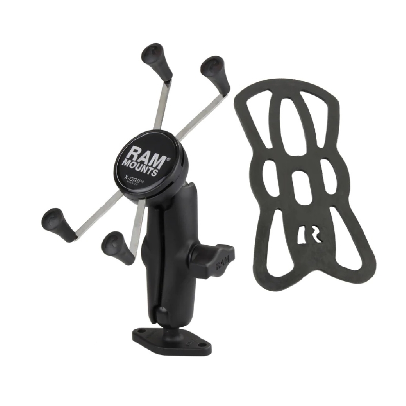 El kit completo RAM-B-102-UN10U consta de un soporte RAM-B-238U con una bola de goma de 1" que se puede instalar en todo tipo de superficies planas en todo tipo de vehiculos, un brazo mediano de aluminio y una base universal X-Grip modelo RAM-HOL-UN10BU con resorte para teléfonos grandes y extra grandes.