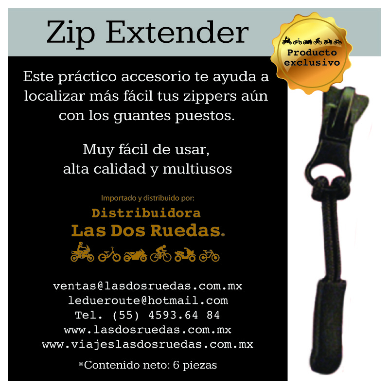Este práctico accesorio te ayuda a localizar y subir o bajar más fácil los zippers de tu chamarra, pantalon o maletas de la moto o bici, aún con los guantes puestos!