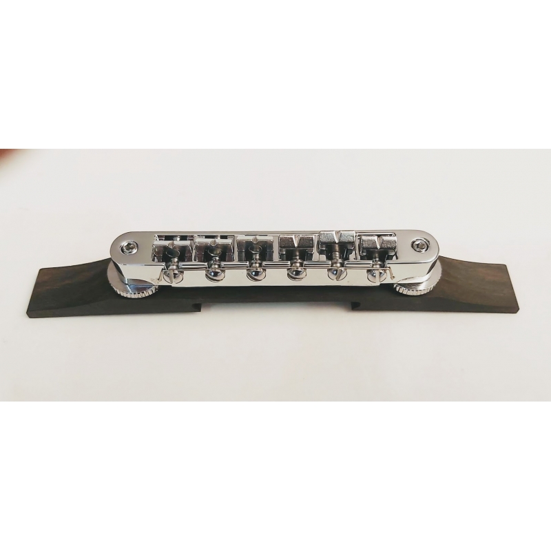 Puente Tune-o-Matic Cromado elaborado sobre base de madera Ebano, muy usual en guitarras tipo Gretsch, Ibanez y otras Huecas y Semihuecas. Para entonaciones más precisas y resonantes.