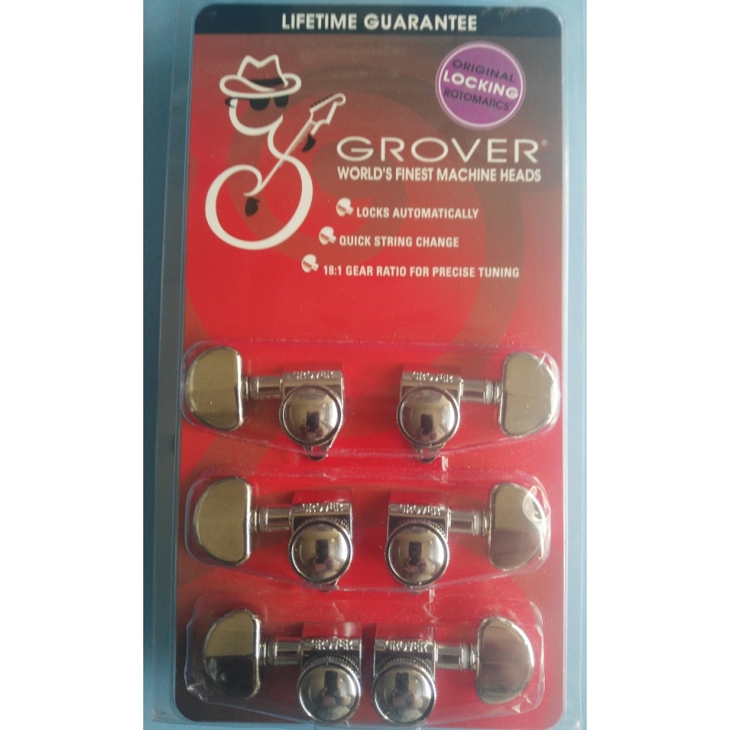 Fina maquinaria estadounidense en formato 3+3 marca Grover modelo Roto-Grip Locking Rotomatics Serie 502C Evita que tu guitarra se desafine con este preciso mecanismo de candado sobre las cuerdas. En cromado brillante a prueba del paso de los años. 18:1 gear ratio. Casillero forjado con lubricación de por vida. Garantizada para toda la vida !