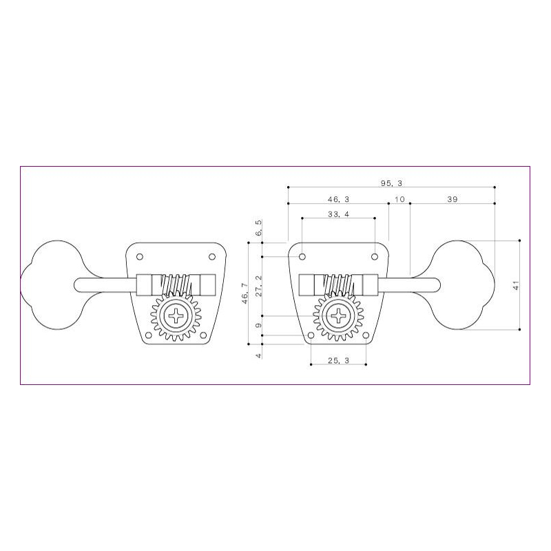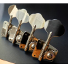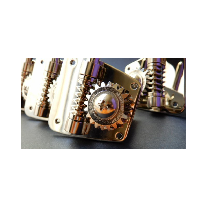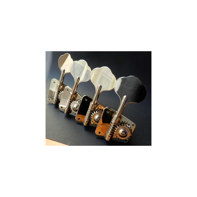 Maquinaría de la prestigiada casa japonesa Gotoh. En niquelado, cuenta con clavijas estilo "oreja de elefante" para bajos con maquinaria 4 en Línea, especial para Américan Precision y Jazz Bass american. Tamaño de la placa es de 46.3 x 46.7mm. Requiere hoyos de 11/16" de diámetro. Incluye tornillos para su instalación.