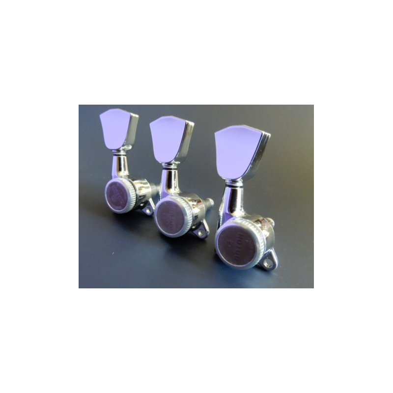 No más desafinadas !!. Producto del fino maquinado y pulido de la casa japonesa Gotoh, está maquinaria Magnum Lock se considera entre las mejores disponibles. Cuenta con candado y clavijas estilo Tulipán cromado muy usadas en guitarras Gibson. Los botones son removibles y el encasillado es de acero forjado y lubricado sellado. Para guitarras con cabezales 3+3. Incluye tornillos para su instalación.