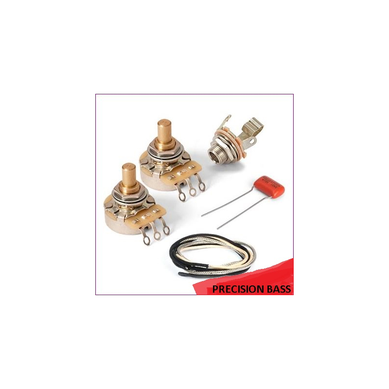 El KIT BAJO PRECISION (y otros bajos de su tipo)  incluye: 2 potenciometros CTS , un jack Switchcraft, un capacitor Orange Drop y Cableado de Circuito Vintage forrado de tela/blindado trenzado.