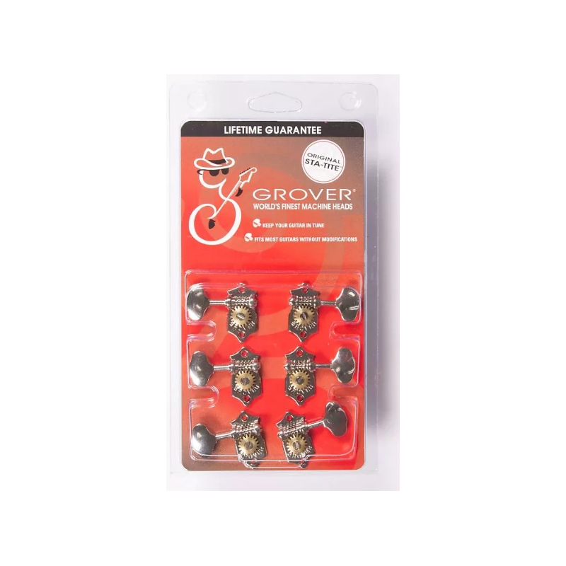 La maquinaria Grover Sta-Tite modelo V7-18NA cuenta con engranes de Ratio 18:1 para un afinado muy fino. Elaborada en color niquel, con placa troquelada y botones vintage tipo Escalopeado. Los postes son de 1/4" (6.3mm) de diámetro e incluye Bushings atornillables y tornillos para su instalación. Para guitarras con paleta sólida de hoyos 11/32" (8.3mm). Instaladas de fábrica en guitarras Gretsch, Martin y otras de su tipo.
