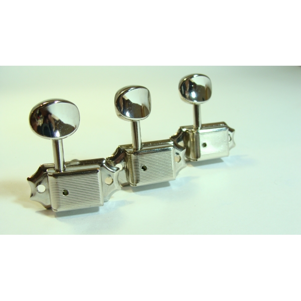 Producto del fino maquinado y pulido japonés, esta maquinaria es una reedición del diseño tradicional de los años 40´s, con clavijas ovales y encasillado de acero forjado. Aunque su estilo es vintage, incorpora las mejoras modernas en el engranaje para un funcionamiento suave y preciso. Para guitarras con cabezales 3+3, requiere hoyos de 8.8 mm o 11/32".Incluye tornillos