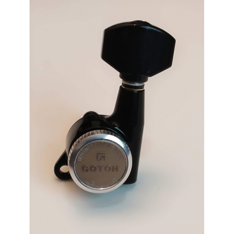 Maquinaria  Gotoh Magnum lock izquierda con candado y de clavijas grandes estilo schaller muy usadas en guitarras modernas. Los botones son removibles y el casillero es de cero forjado y lubricado sellado.  Para guitarras izquierdas o clavijas hacia abajo,  6 en Línea. Incluye tornillos para su instalación.