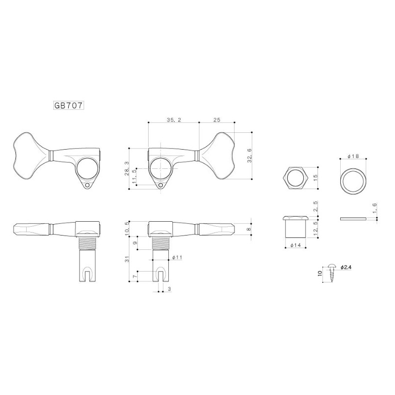 Maquinaria de acero forjado, con lubricación sellada. Esta versión Black Cosmo (Negro Humo) de clavijas compactas es exacta para cabezales de modalidad 2+2. Requiere hoyos de 9/16". Incluye tornillos.