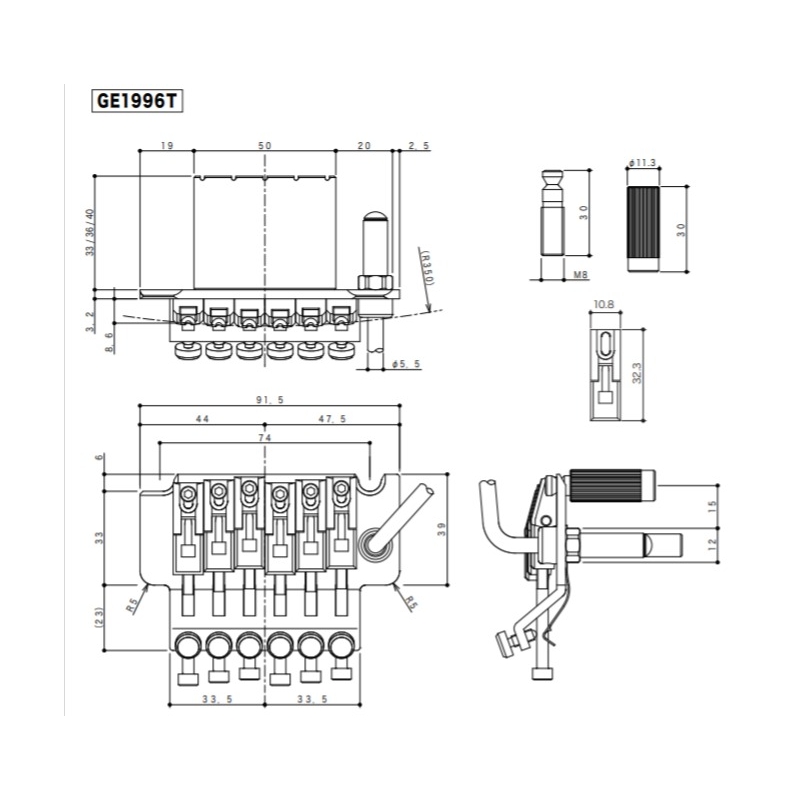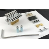 Floyd Rose fabricado por Gotoh bajo licencia. Modelo GE1996T. Las monturas están elaboradas en acero con un radio de 350mm. La distancia entre cuerdas es de 10.8mm. El bloque es de 36 mm de altura. La cejilla candado es de 43mm con atornillada por arriba del brazo. Si necesitas otra medida contáctanos. El acabado es magnífico, finamente pulido sea en color Cromado, Negro o Dorado.. El set es completo e incluye todo lo necesario para su instalación.