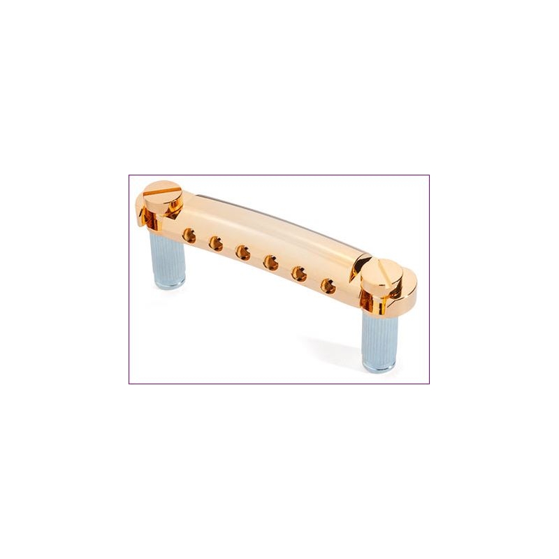 Tiracuerdas (Tailpiece) estilo manufacturado con materiales sólidos y muy durables. Su terminado es dorado brillante fino. La distancia de entrepostes es de 81.8 mm de mitad a mitad de las ranuras sujeta postes. Para guitarras Les paul Gibson y otras de su tipo. Incluye postes y sockets rosca standard para su instalación.