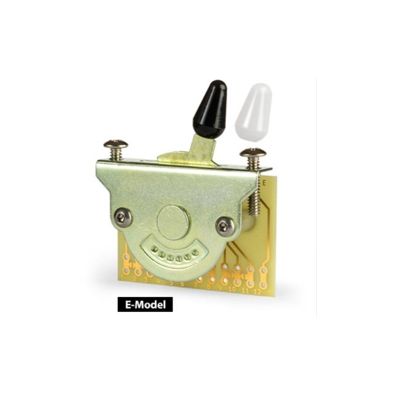 Este modelo de switch permite hacer conexiones que no son posibles con un switch normal de 5 pasos.  Con 12 Lugs (patas) permite el doble de conexiones que el switch simple, para separar coils de humbuckers, controles de tono o combinaciones de pastillas.  Muy recomendado para guitarras con configuración de pastillas HSS (Humbucker-Scoil-Scoil), HSH, H-H. Incluye tornillos y diagrama para su instalcion.