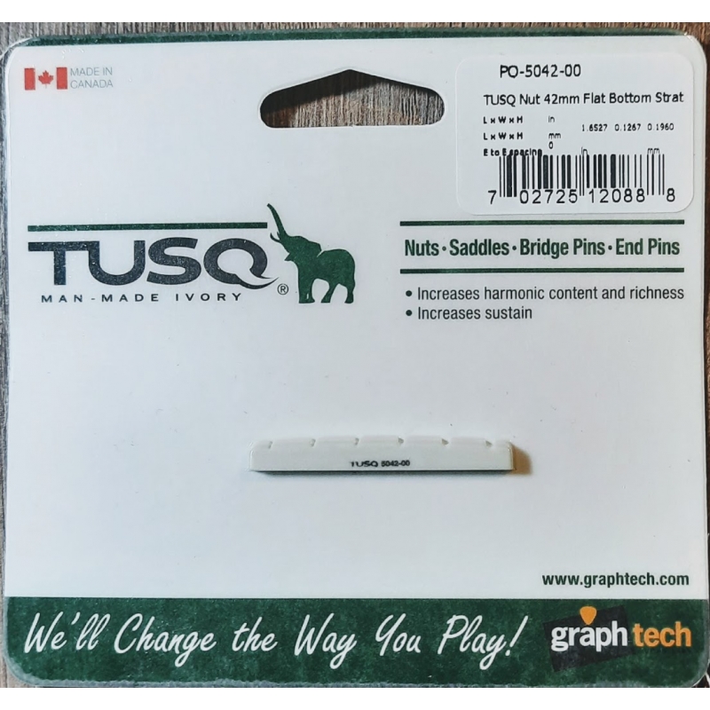 Cejilla Pre ranurada de 42mm especial para Guitarras Stratocaster. Tusq de GraphTech es Diseño de ingeniería y está impregnada con PTFE; es 5 veces más deslizante que el grafito. Reduce la rotura de cuerdas, mejora la entonación y resalta los armónicos en el rango medioy alto. Tusq transfiere en forma correcta y  eficiente las frecuencias correctas de las cuerdas al cuerpo de la guitarra. claros. Medidas: largo 42, ancho 3.2 y alto 5mm. Distancia total entre cuerdas 35.2mm.