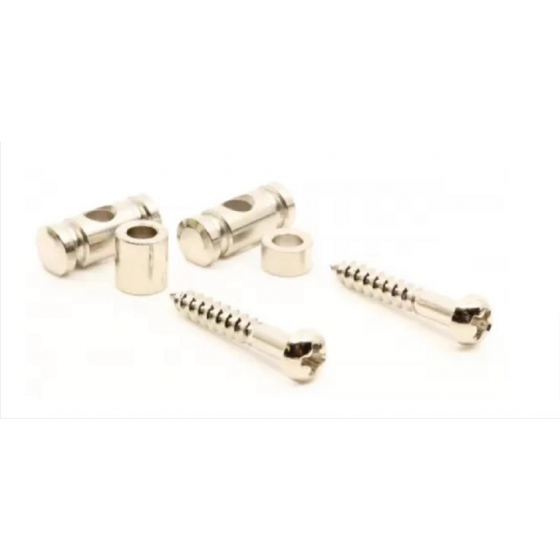 Estos retenedores de metal cromado se utilizan tradicionalmente en guitarras Fender Stratocaster, Telecaster y también en otras de cabezal similar. Su función es mantener el ángulo de las cuerdas en el soporte de hueso. Se vende en juego de 2 e incluye tornillos.