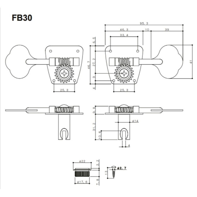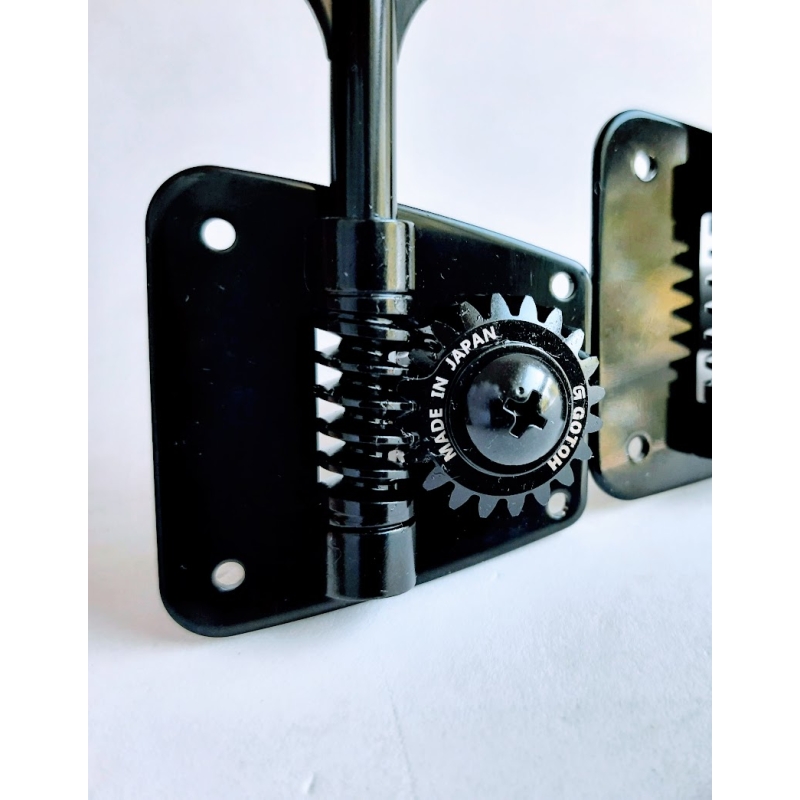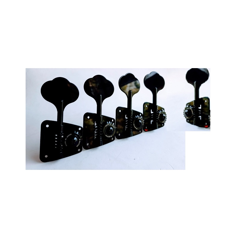 Maquinaría COLOR NEGRO de la prestigiada casa japonesa Gotoh. Cuenta con clavijas estilo "oreja de elefante" para bajos con 5 cuerdas, 4 en línea arriba y una abajo.especial para Precision y Jazz Bass. Tamaño de la placa es de 46.3 x 46.7mm. Requiere hoyos de 11/16" de diámetro. Incluye tornillos para su instalación.